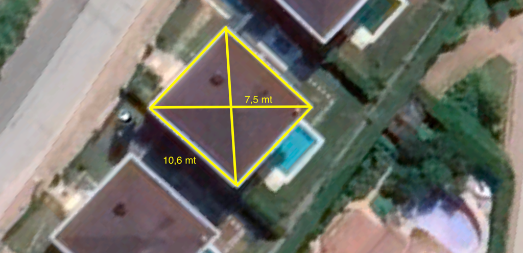 Aşağıda örnek çatımız görünmektedir. Bu çatının ölçülerini alarak fotovoltaik panel yerleşimi yapacağız ve kaç kWp güç sığacağına bakacağız. (Baca, çatı çıkışı vb ihmal edilecektir.)
