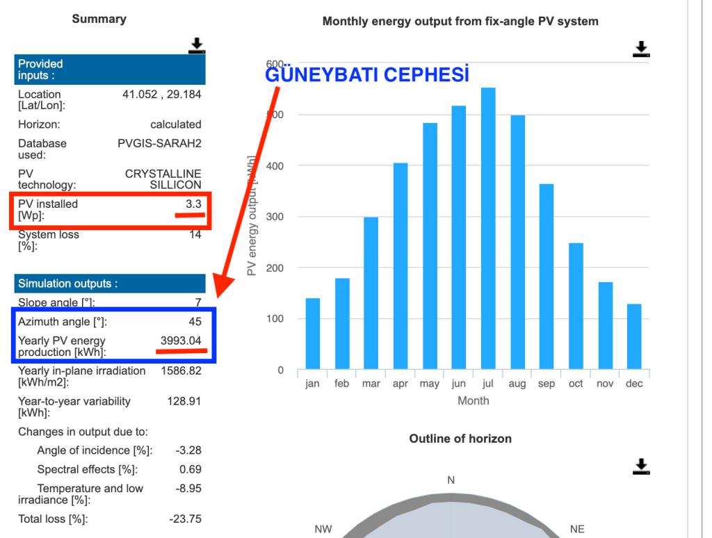 Güneybatı ( 45 derece) cephesi üretim değerinin en yüksek olduğu cephedir ve yıllık üretim değeri 3.993,04 kWh olmuştur.