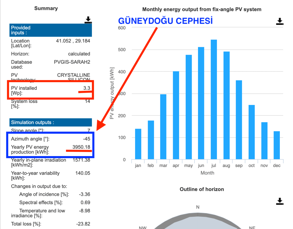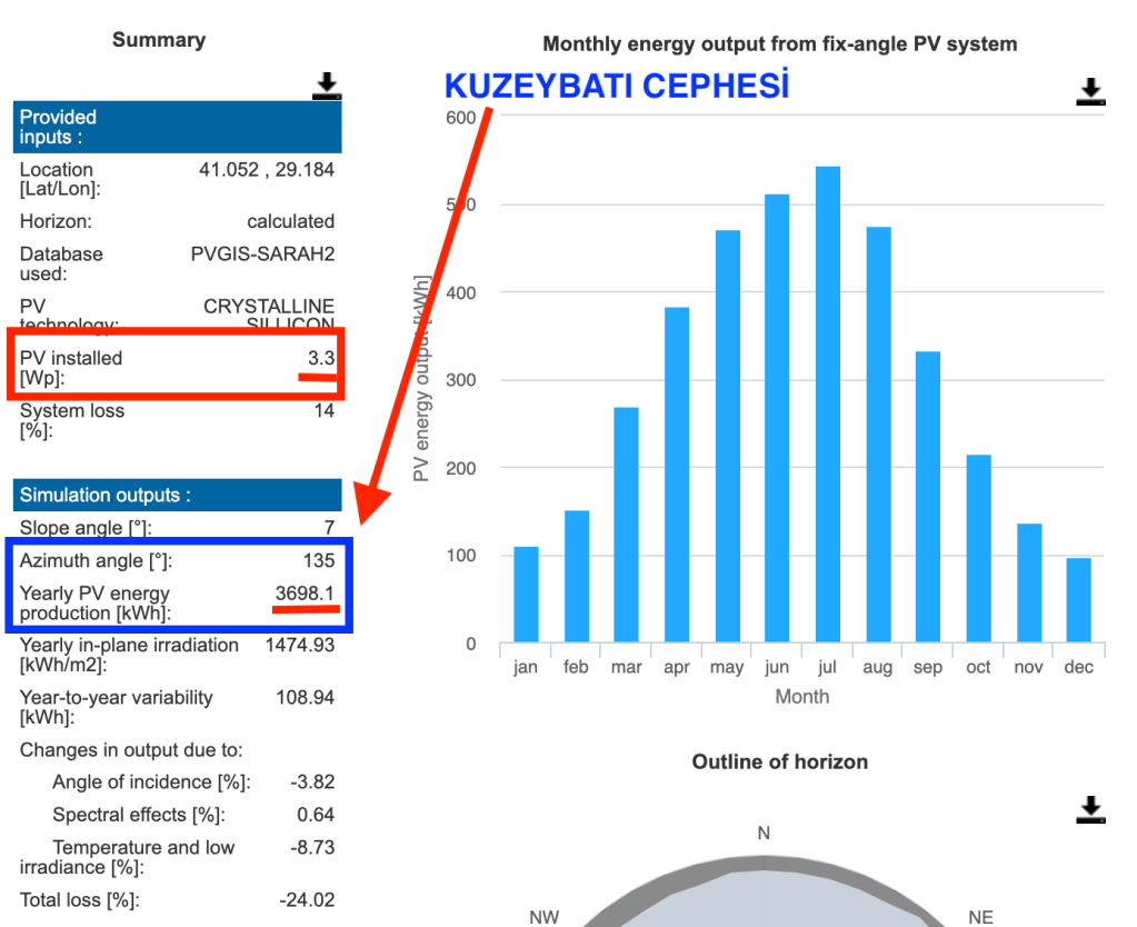 Şimdi bu tesisin üretim değerlerini hesaplayalım. 10 kWe / 13,2 kWp güç değerlerine sahip bir konut GES tasarlamış olduk. Çatımızın dört cephesi var ve her cehpeye PV yerleşimi yaptık. Her cehpenin üretim değerleri birbirinden farklı olacaktır. Biz kuzey yarım kürede yaşadığımız için en iyi üretim değerini PV güney cepheye uygun açıda baktığı zaman yakalayabiliyoruz. Ancak çatı açı değerleri küçük olduğu için cepheler arası üretim farkı çok çıkmayacaktır. Konum olarak İstanbul seçerek üretim değerlerimize bakalım.