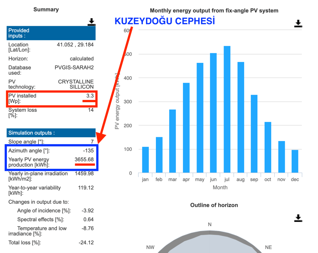 Kuzeydoğu (-135 derece) cephesi ise en düşük üretim değerine sahip cephedir ve yıllık üretim değeri 3.655,68 kWh olmuştur.